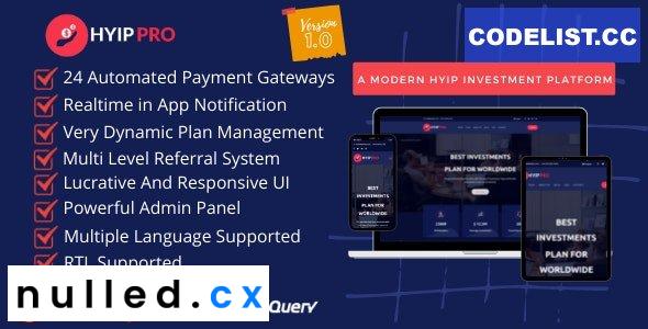 HyipPro Nulled is an automated hyip investment script for web platform. It’s a script for investment that can be used for various purposes. HyipPro comes with the features like deposits, withdraw, investment plans, bonus, referral commission, so on and so on. It is seo friendly, modern architectural and secure web application. It has very eye catchy dynamic theme for frontend, user panel and admin panel. If you are looking for hyip investment script which will gear-up your business into the next level then HyipPro will be the right choice for you. You can enjoy a lots of features along with 24 payment gateways and real-time in app notifications. We can say that this is the script which you are looking to start your hyip investment business.